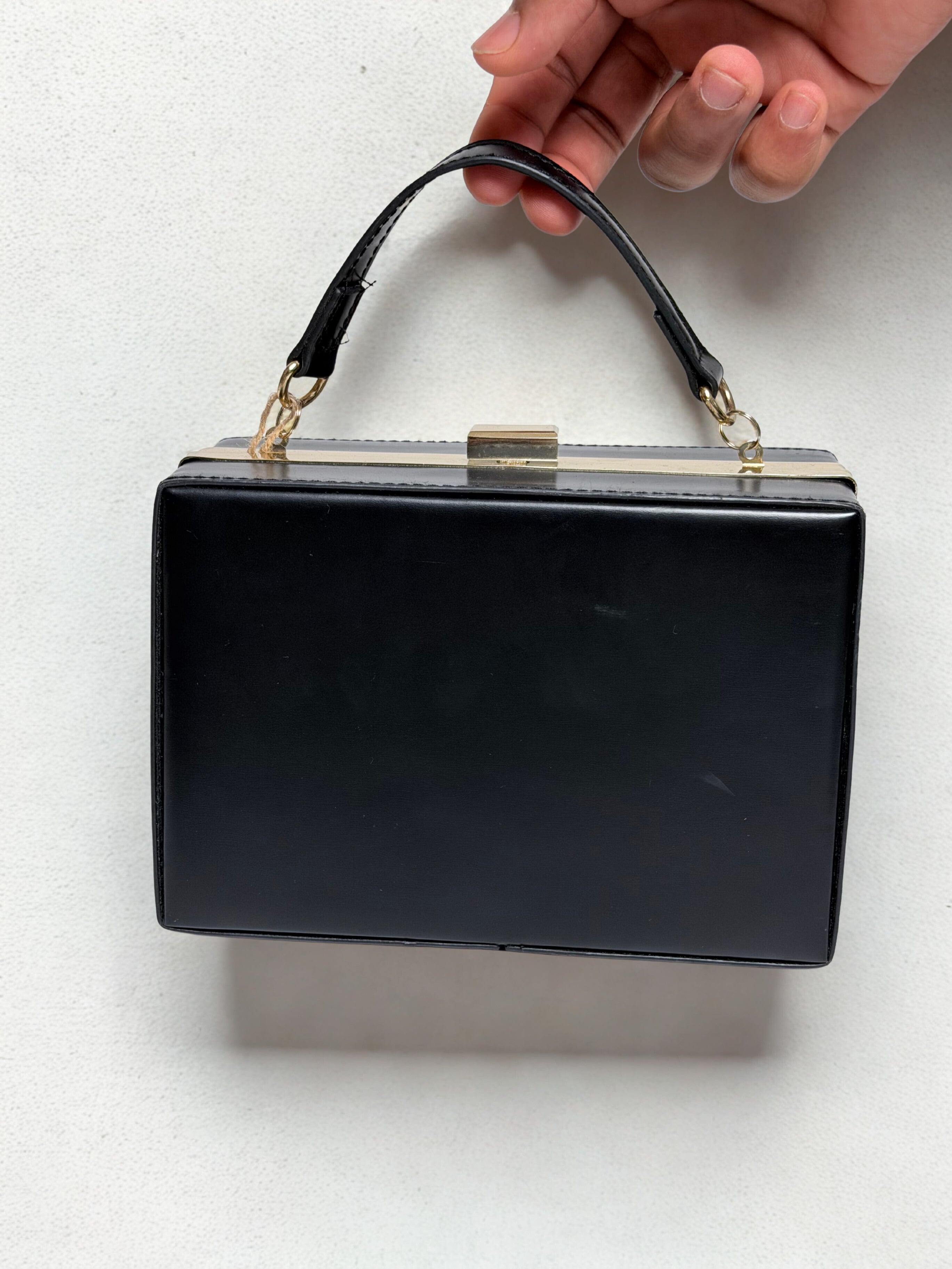 This stylish black handbag features a sleek design with a gold clasp. Ideal for a variety of occasions, it can complement both casual and formal outfits. The sturdy handle ensures easy carrying, making it a versatile addition to any wardrobe. Perfect for storing essentials while adding a touch of elegance to your look.