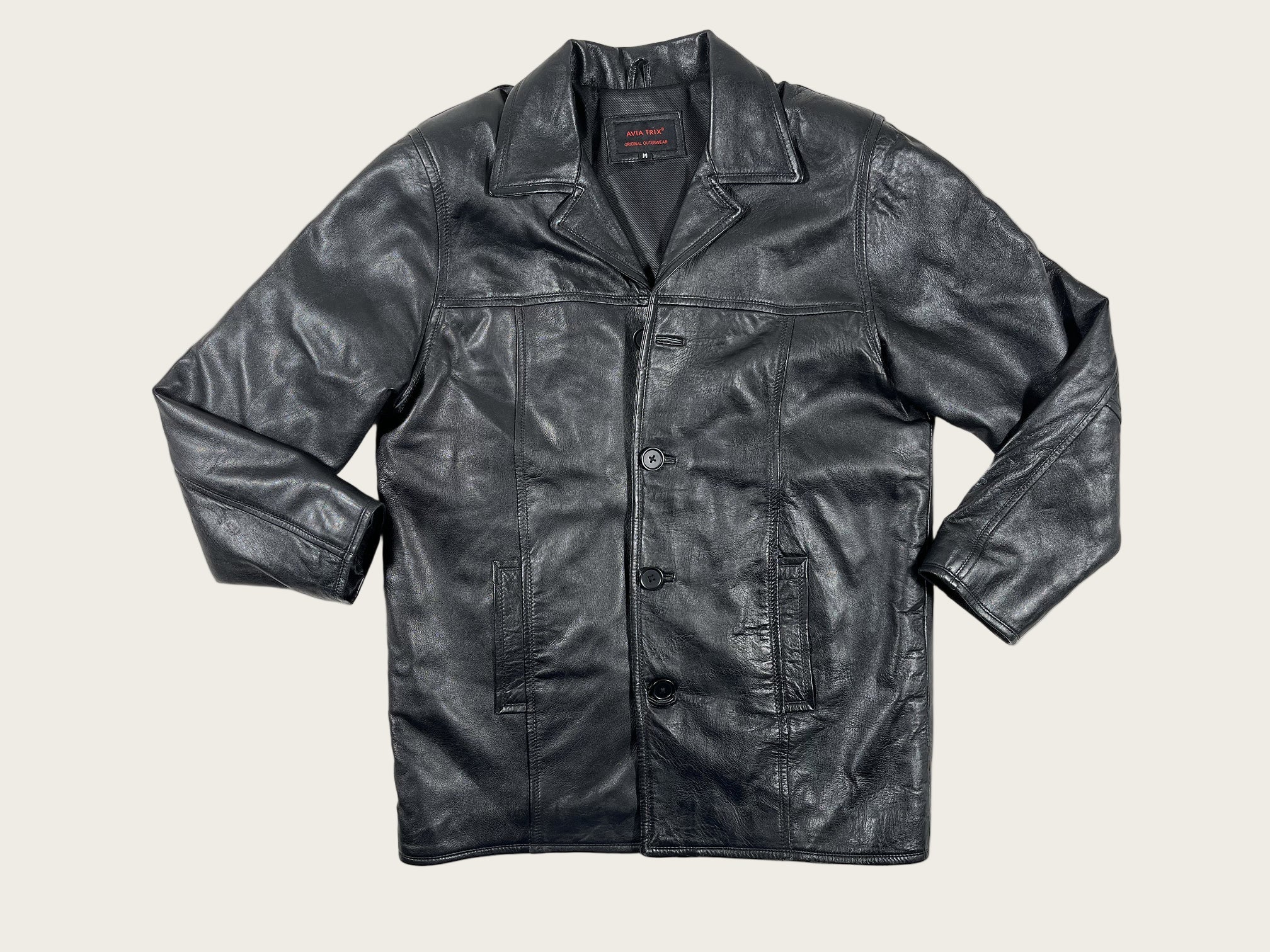 This stylish black leather jacket features a classic design, perfect for both casual and formal occasions. With its sleek finish and comfortable fit, it's an ideal addition to any wardrobe. The jacket includes functional pockets and a button-up front, combining practicality with fashion. This versatile piece can easily be dressed up or down for various events.