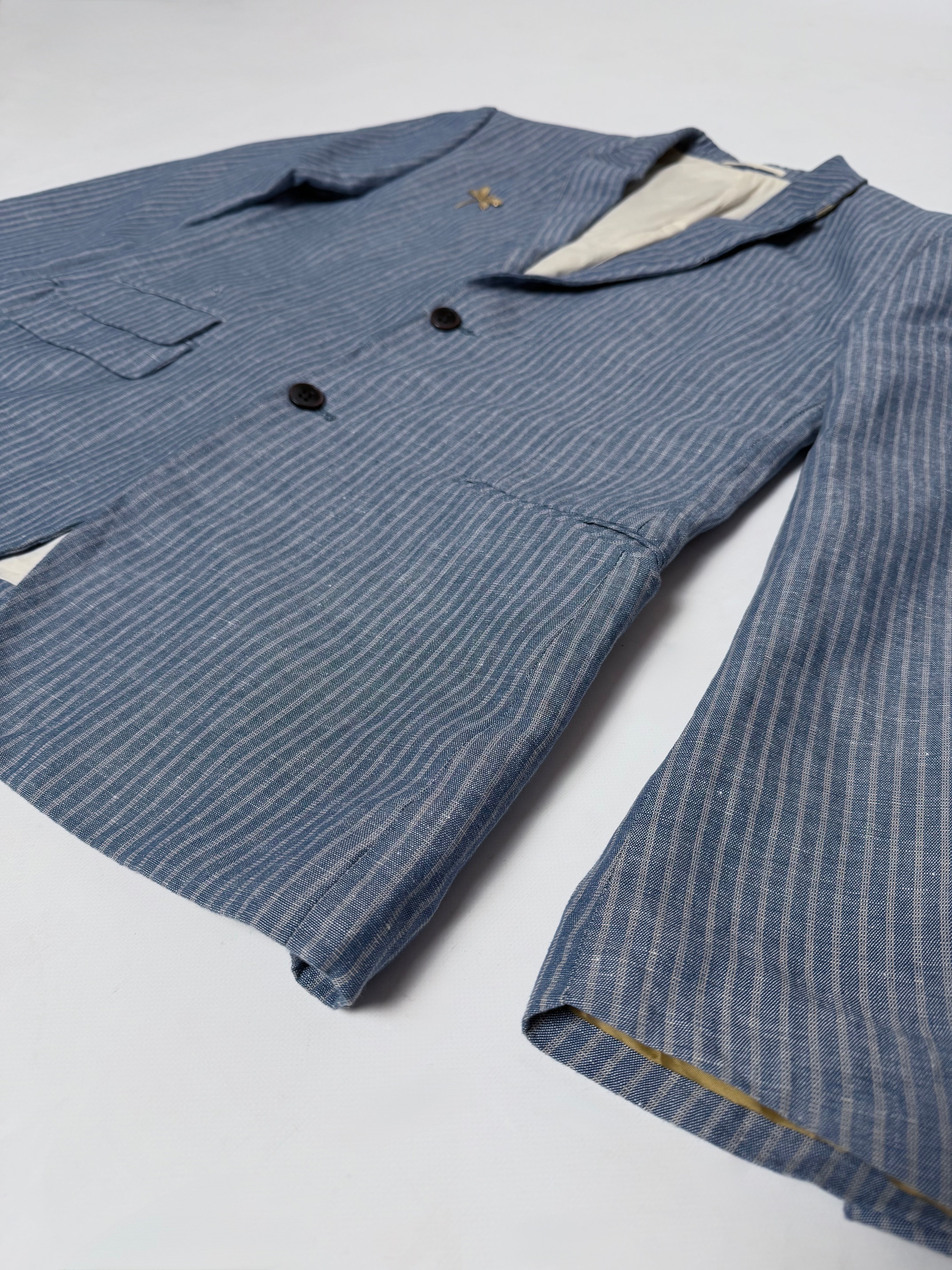 Effortless elegance with a modern edge. This Rocha John Rocha blazer features a refined blue striped pattern, combining classic tailoring with a fresh, contemporary feel. Crafted from a breathable cotton and linen blend, it offers comfort and versatility for warmer seasons. With s structured silhouette and high-quality finishing, this blazer transitions seamlessly from smart casual to polished looks.