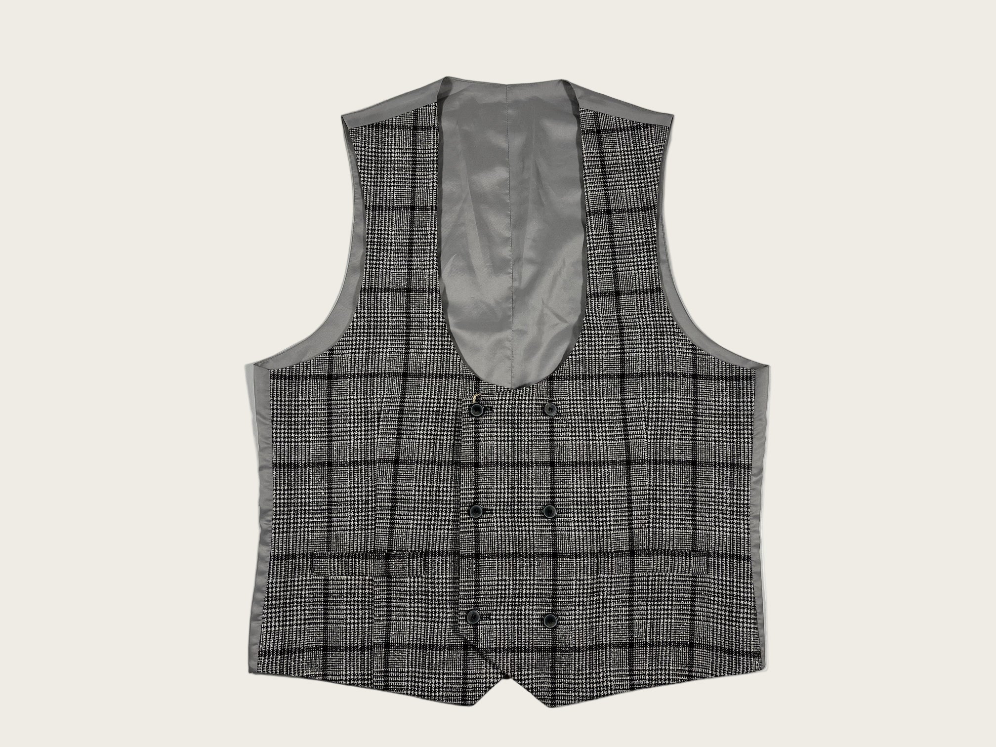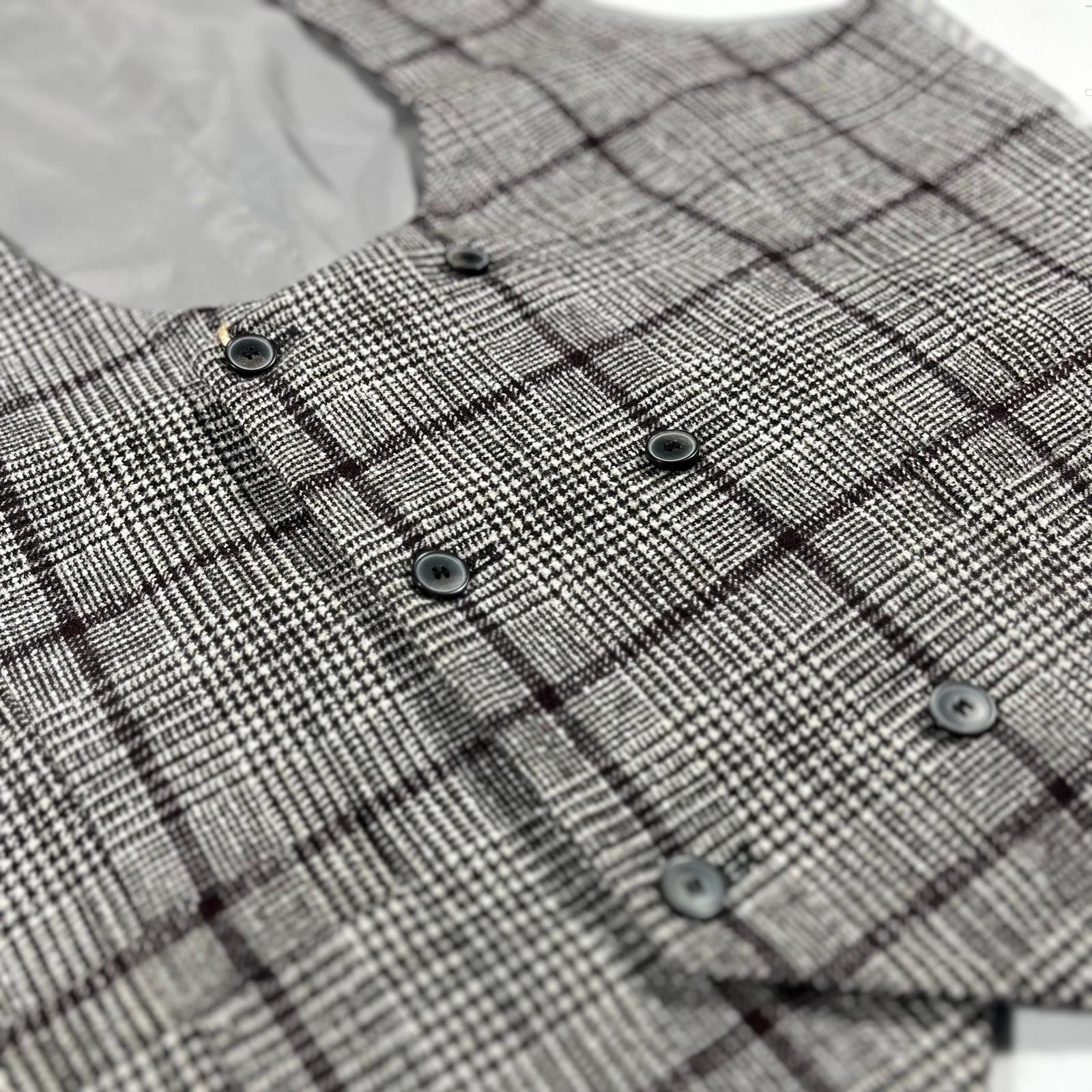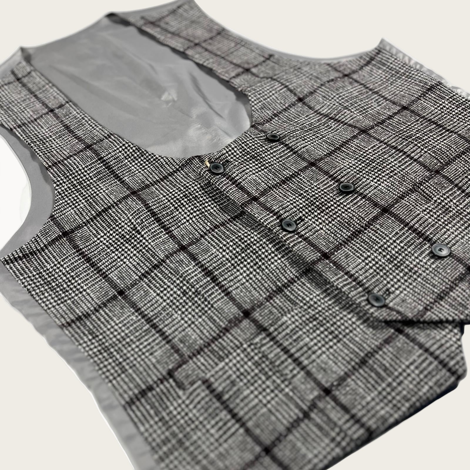This stylish grey checkered vest features a modern cut with a v-neck design. It is made from high-quality fabric and is perfect for layering over a dress shirt or wearing as part of a formal outfit. The versatile pattern makes it suitable for various occasions, whether formal or semi-formal. Pair it with trousers or jeans for a chic look.
