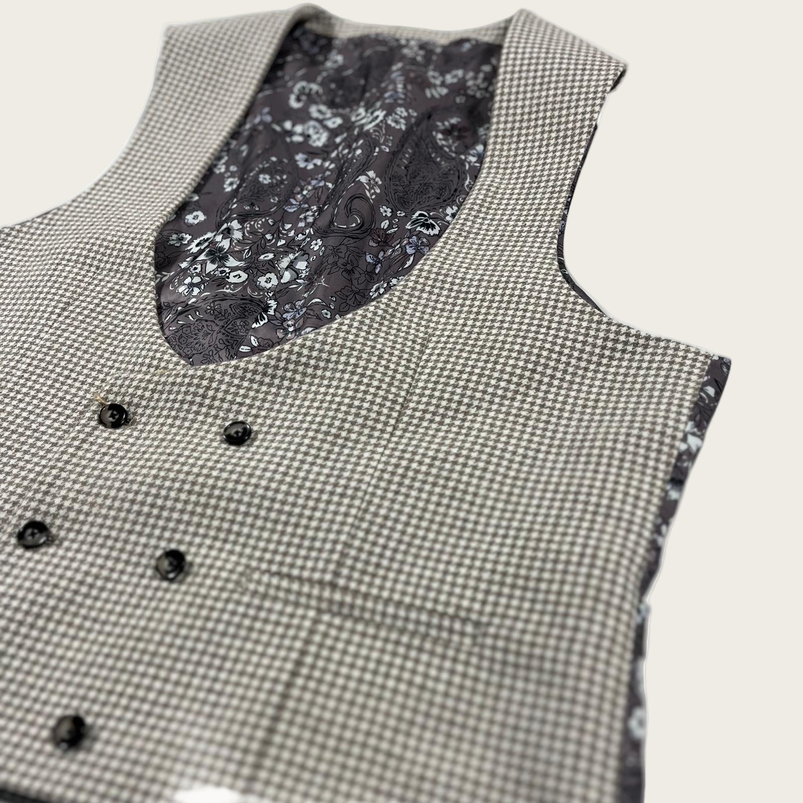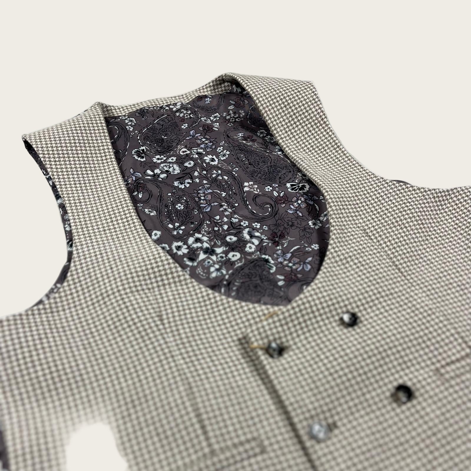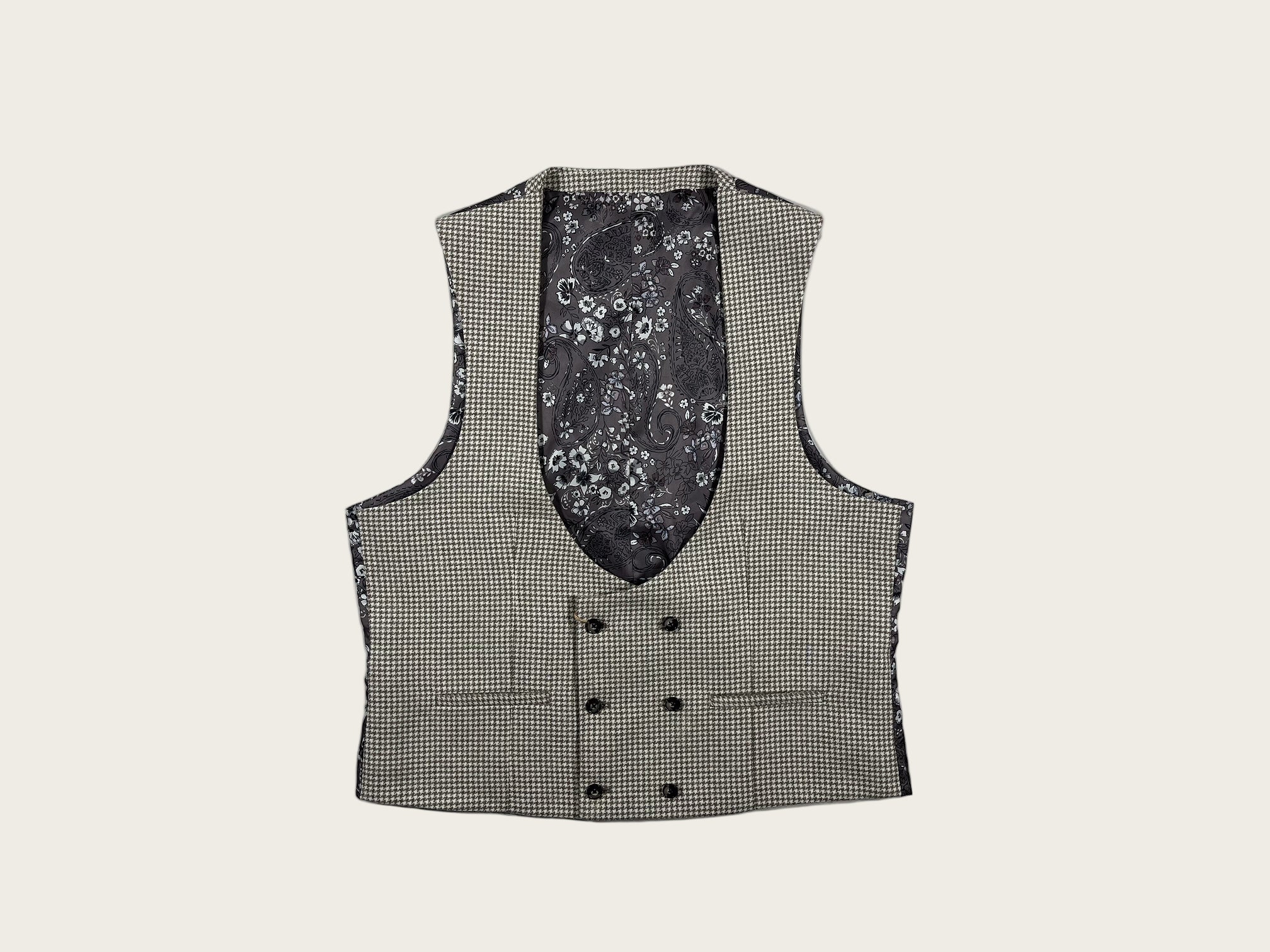 This men's vest features a classic houndstooth pattern on the exterior and a refined paisley design on the inside. Crafted for both comfort and style, it enhances any formal or semi-formal outfit. Perfect for adding a touch of sophistication, this versatile piece can be paired with various shirts and trousers.