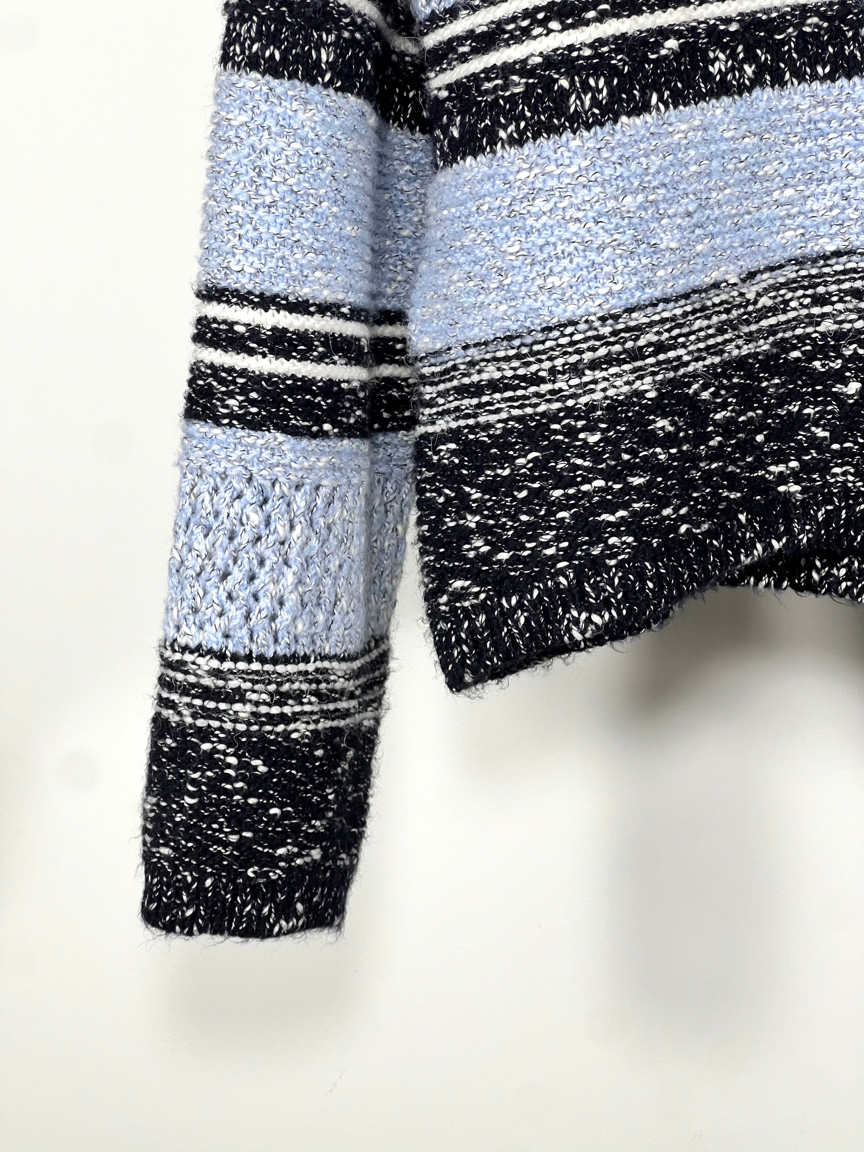 Structured knit cardigan with a textured, speckled finish and horizontal stripes in black, light blue, and off-white. Features a round neckline and fabric-covered front buttons. A versatile statement piece, perfect for layering or wearing on its own. - Size: UK L / EUR 44-46 - Fit: Structured, slightly cropped