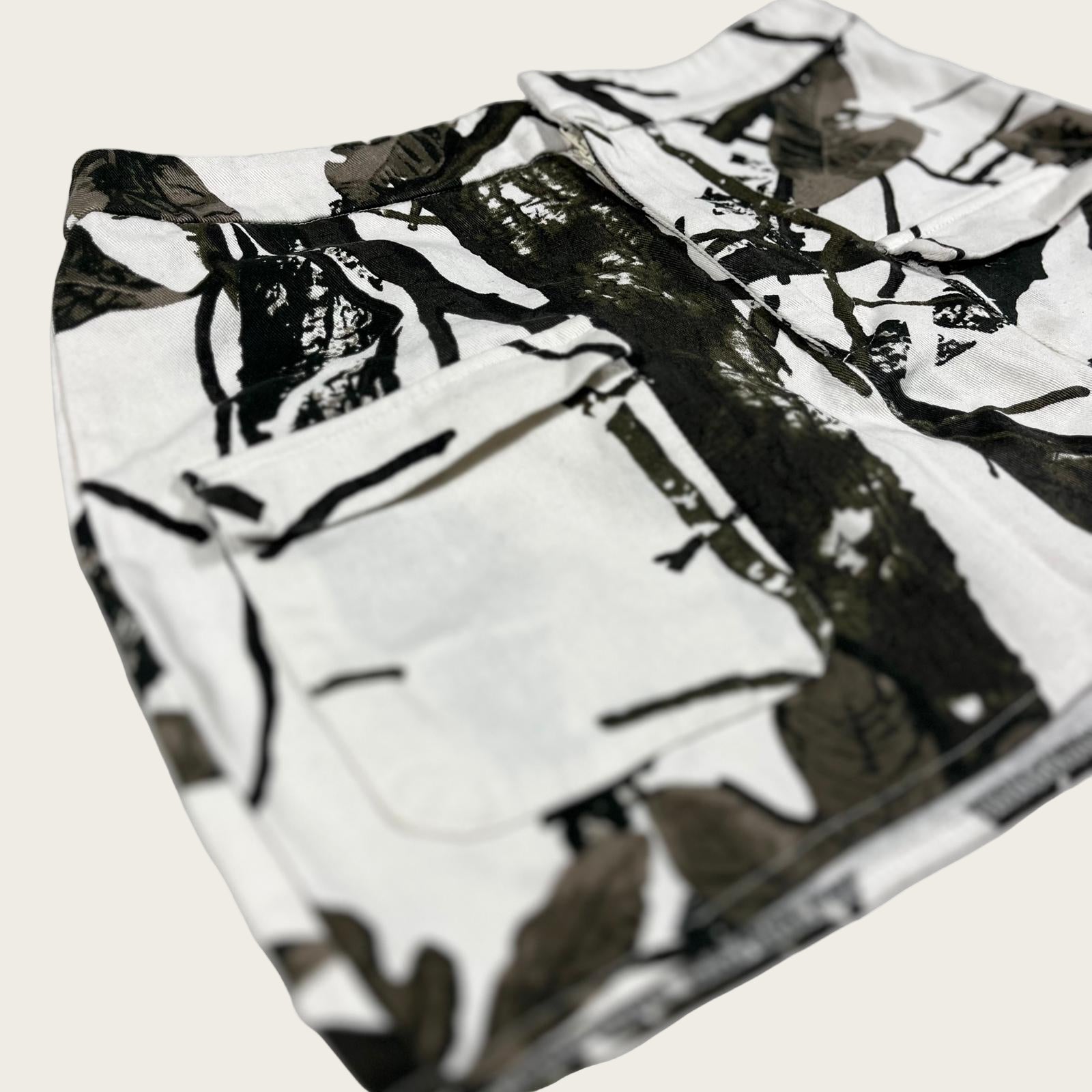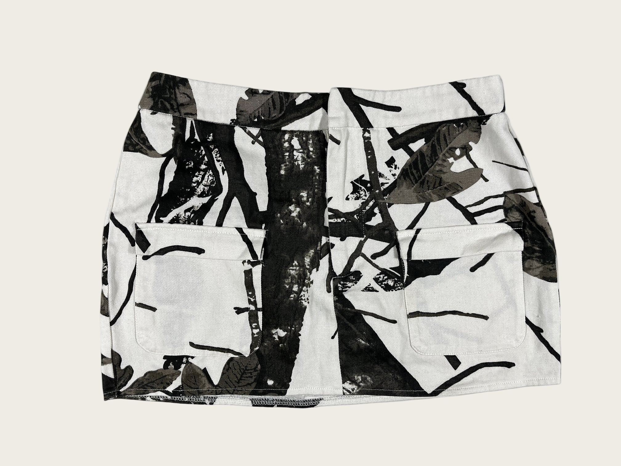 This women's skirt features a unique camo print design with black and white colors. It's perfect for casual outings and pairs well with a variety of tops. The two front pockets add practicality and style, making it a versatile addition to your wardrobe. Ideal for warm weather, this skirt offers comfort without sacrificing fashion.